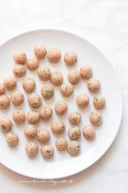 Disporre le polpette e i cavolini in una pirofila, irrorarli con un filo d'olio e infornare a 180° finchè saranno dorati (o, se preferite, potete friggerli). Le polpette sono una sorta di kofta italianizzate (visto che usato la carne di maiale). Come fare spiedini di feta. Gli spiedini di polpette e patate sono un'idea sfiziosa da servire come aperitivo o anche come secondo di carne, specie per i più piccoli. Formare le polpette con le mani, passarle velocemente nel pane grattugiato e suddividerle equamente in 4 spiedini.